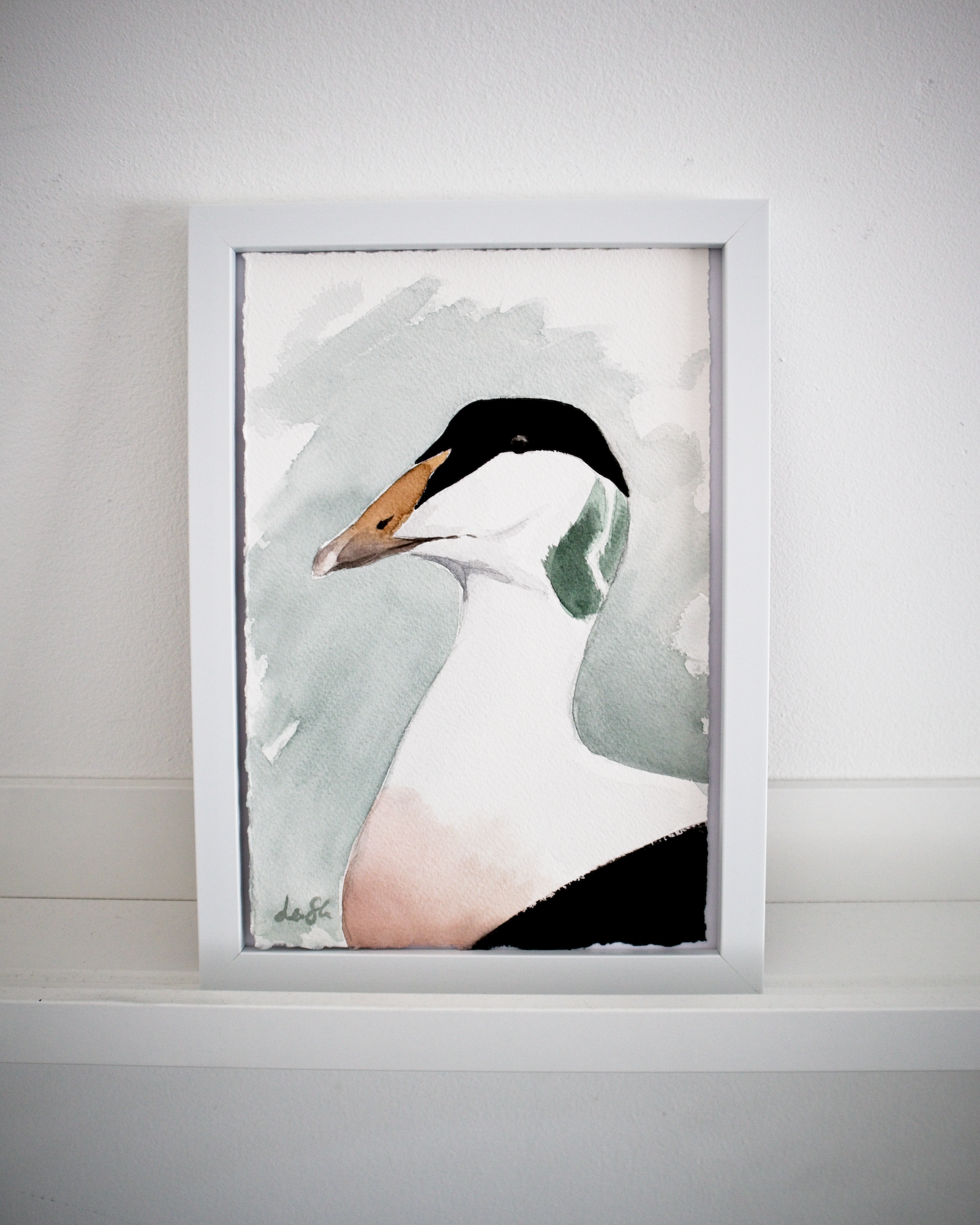 A portrait of a male eider, painted with Winsor & Newton professional watercolors on Arches 640g 100% cotton paper. The painting measures 19 x 29cm / 7.5x11.2 in, and has beautifully deckled edges.