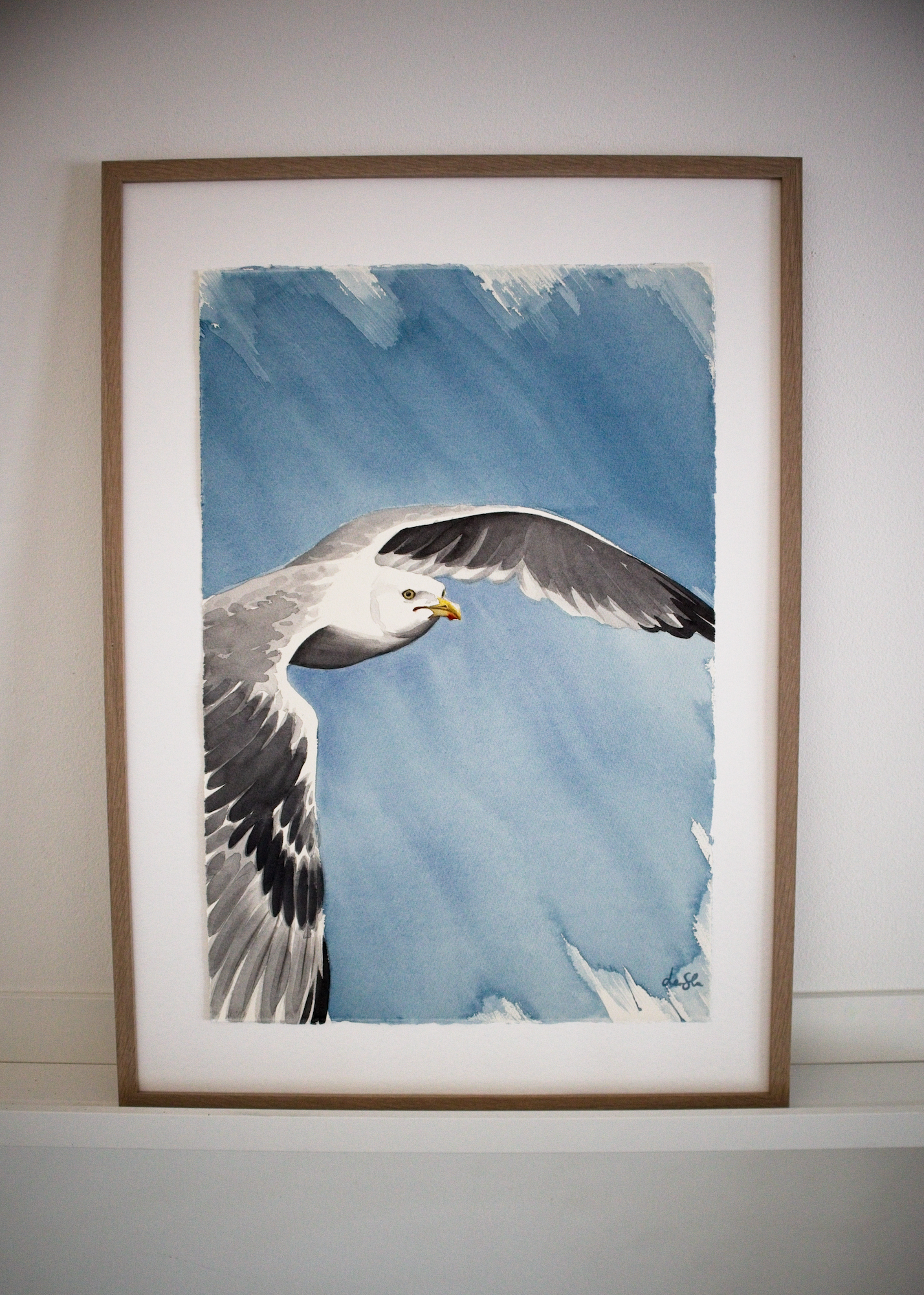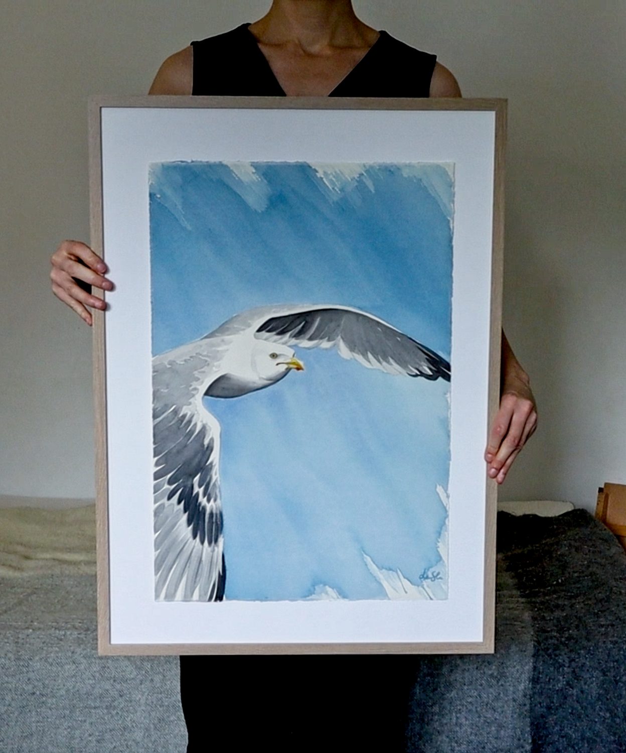 A close encounter with a seagull, painted with Winsor & Newton professional watercolors on Saunders Waterford 100% cotton paper. The painting measures 38 x 56,5cm / 14.9x22.2 in, and has beautifully deckled edges.