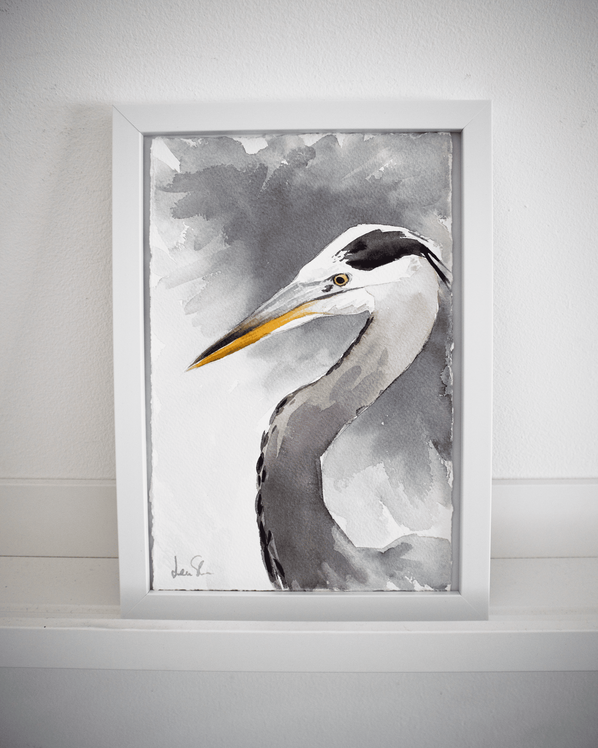 A majestic grey heron, painted with Winsor & Newton professional watercolors on Arches 640g 100% cotton paper. The painting measures 19 x 29cm / 7.5x11.5 in, and has beautifully deckled edges.