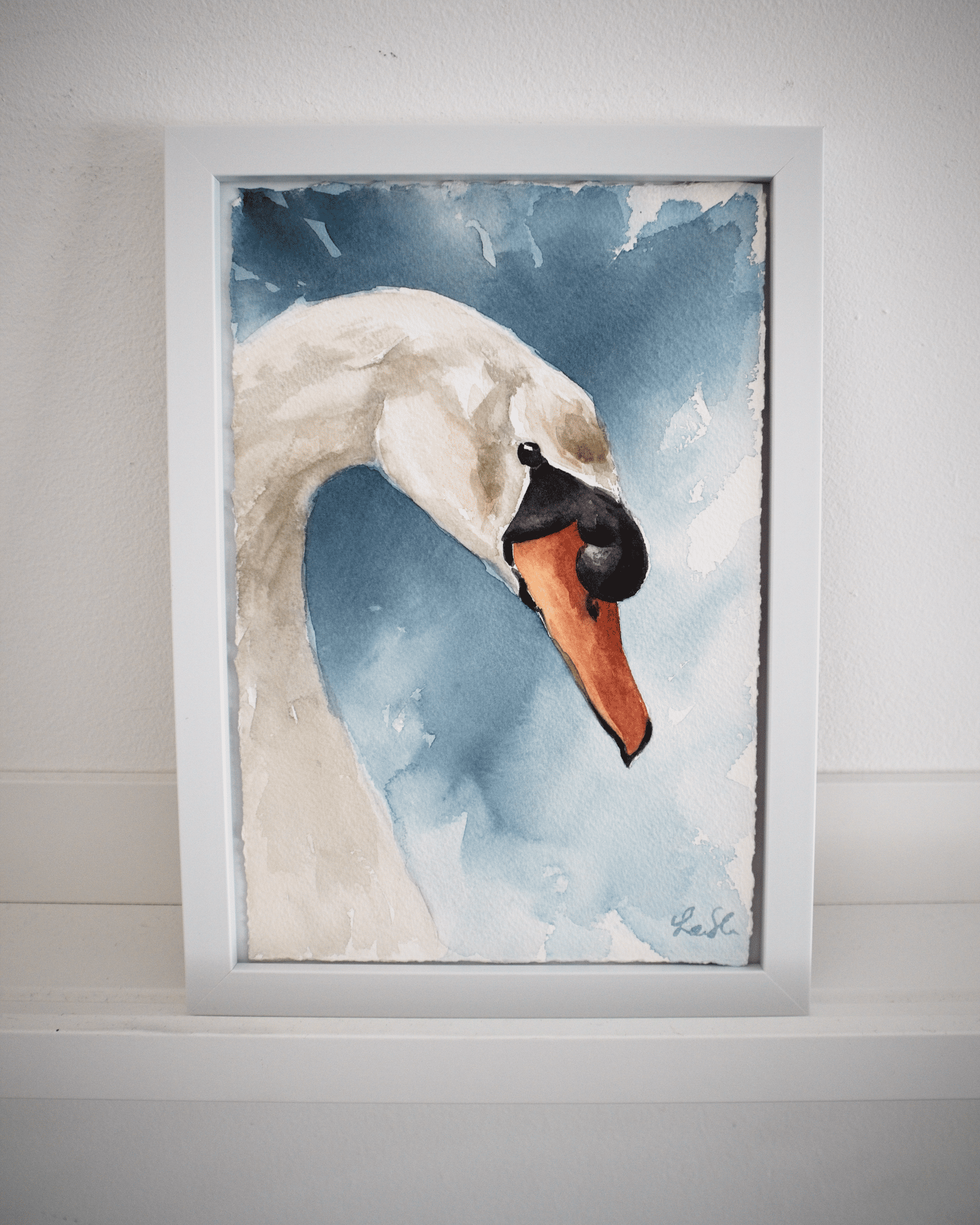A portrait of a mute swan, painted with Winsor & Newton professional watercolors on Arches 640g 100% cotton paper. The painting measures 19 x 29cm / 7.5x11.2 in, and has beautifully deckled edges.