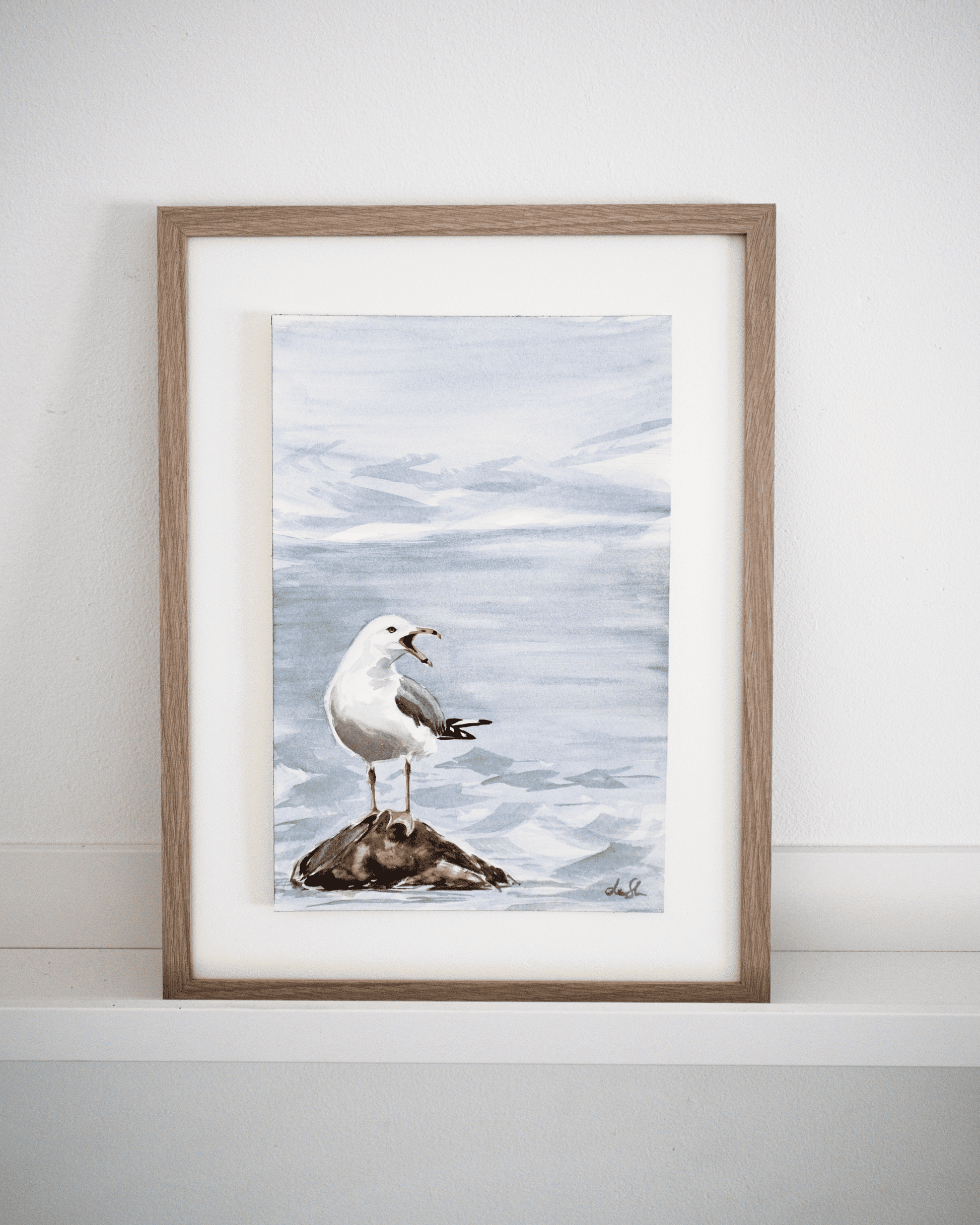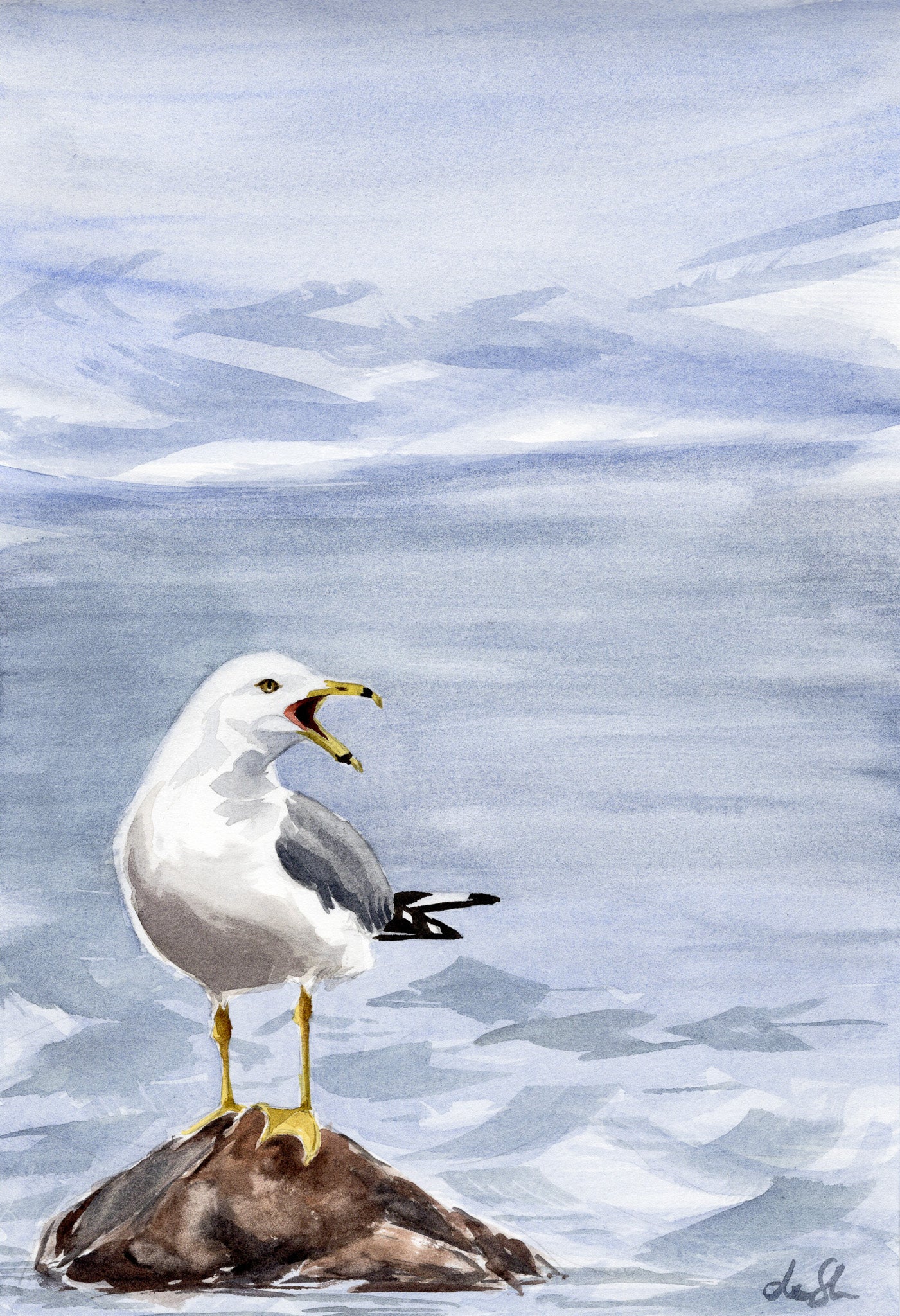 A yelling gull, painted with Winsor & Newton professional watercolors on Canson Heritage 100% cotton paper. The painting measures 20,5 x 31cm / 8x12 in.