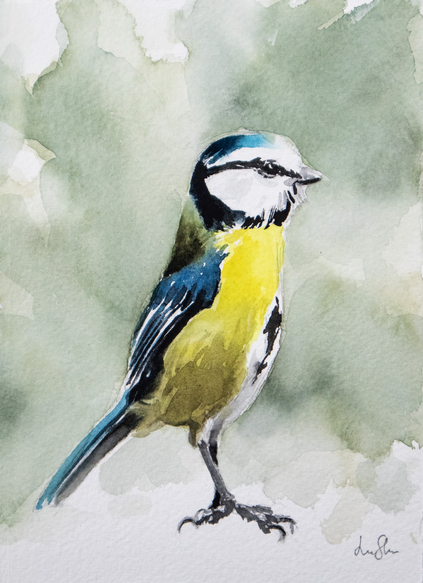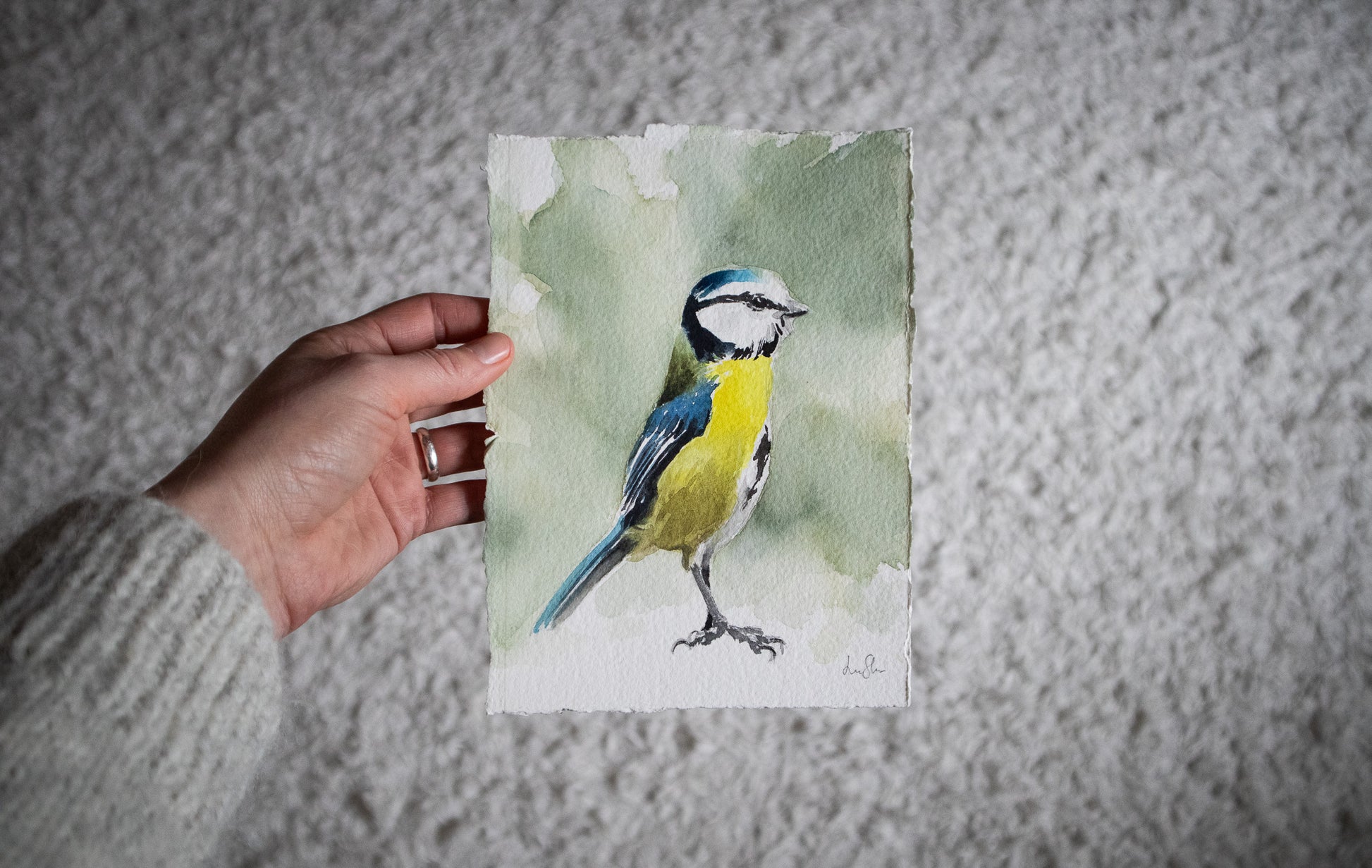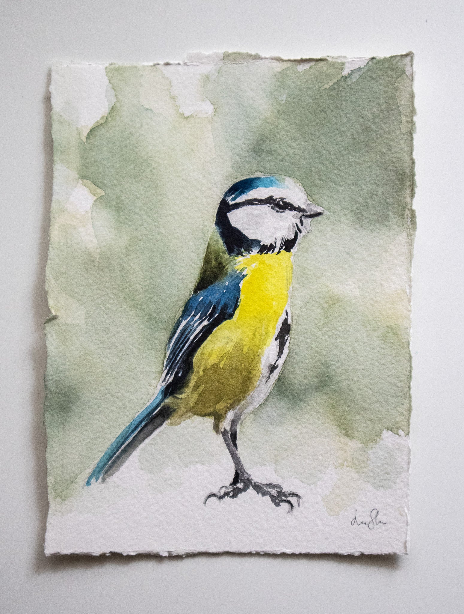 En blåmes, målad på tjockt, lyxigt Arches bommullspapper. Målningen mäter 14 x 19 cm och har vackert rivna kanter.