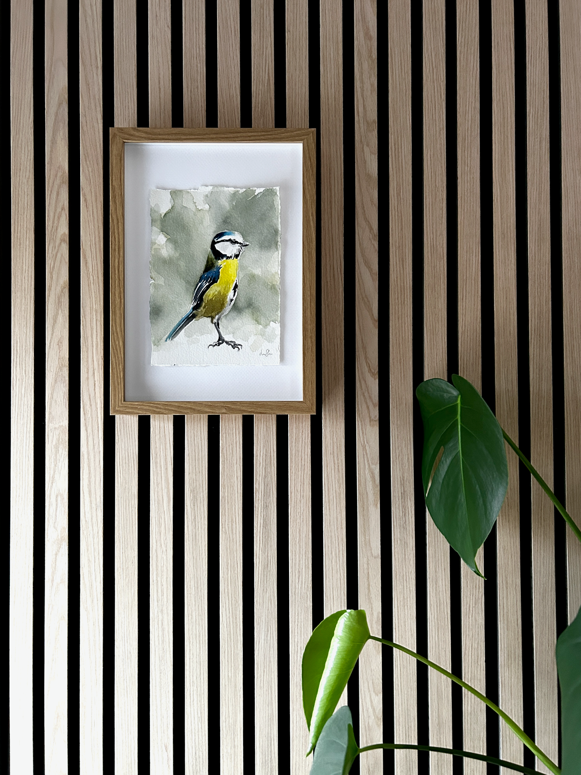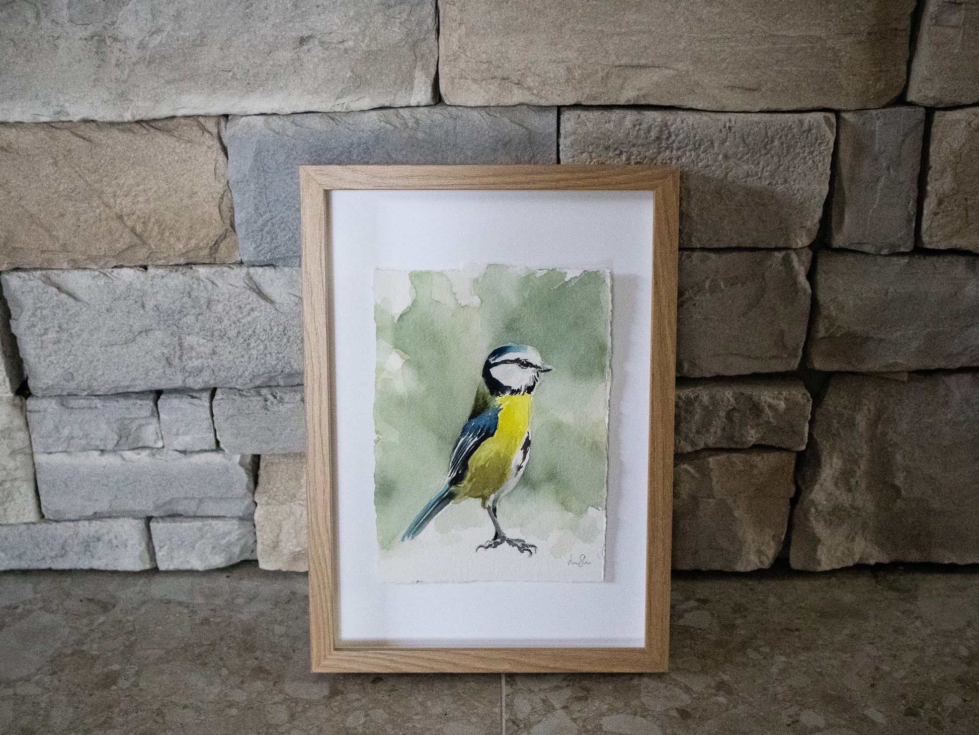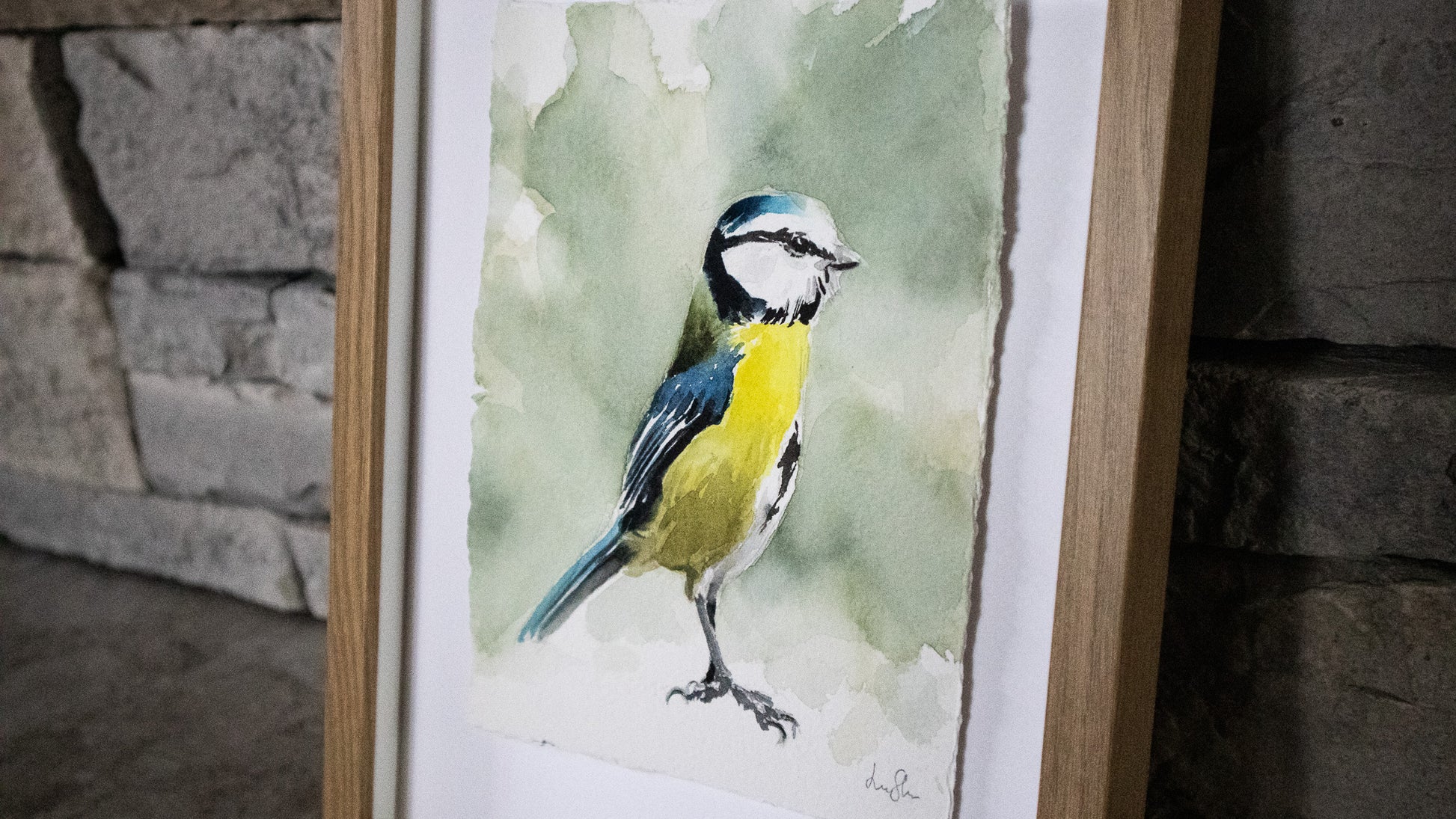 En blåmes, målad på tjockt, lyxigt Arches bommullspapper. Målningen mäter 14 x 19 cm och har vackert rivna kanter.