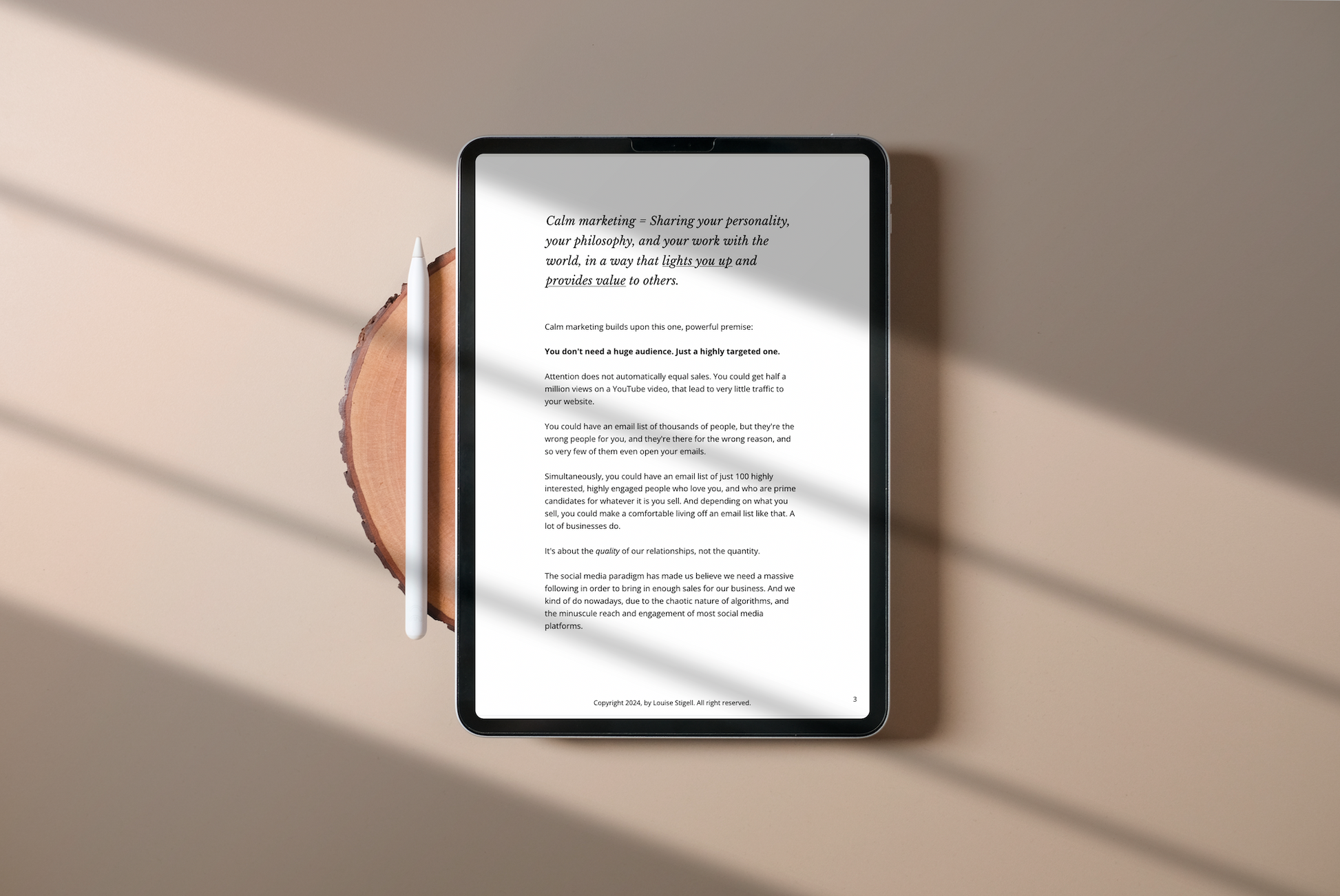 In this guide/workbook, I share my simple, time-tested, and effective approach to marketing your art business. Without sleazy tactics. Without buying ads. Without overwhelm and burnout.