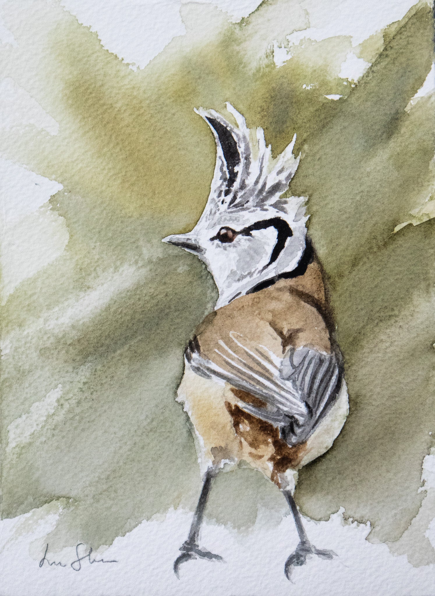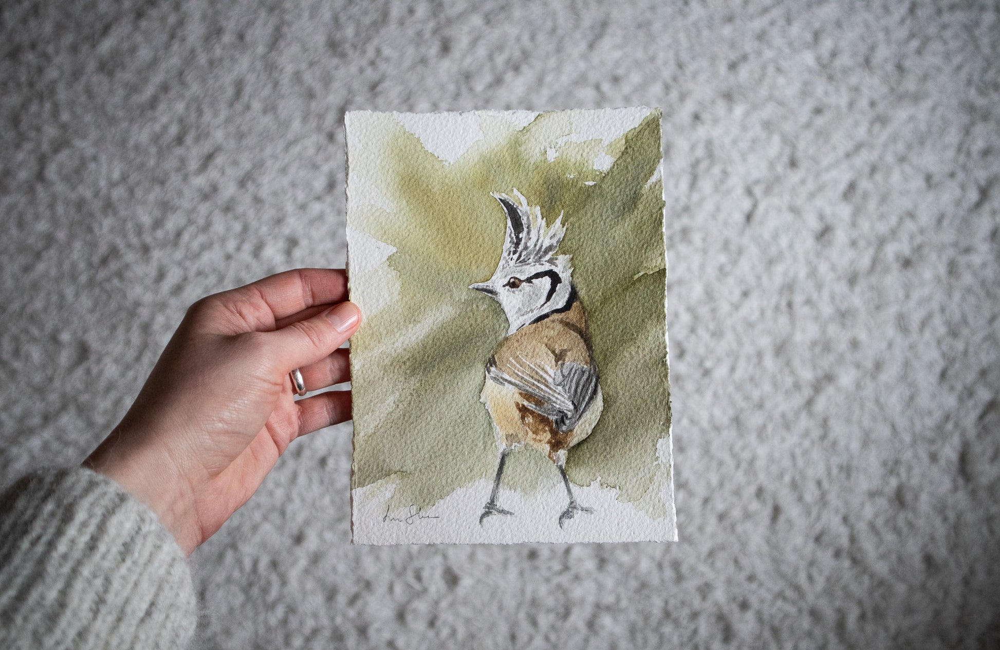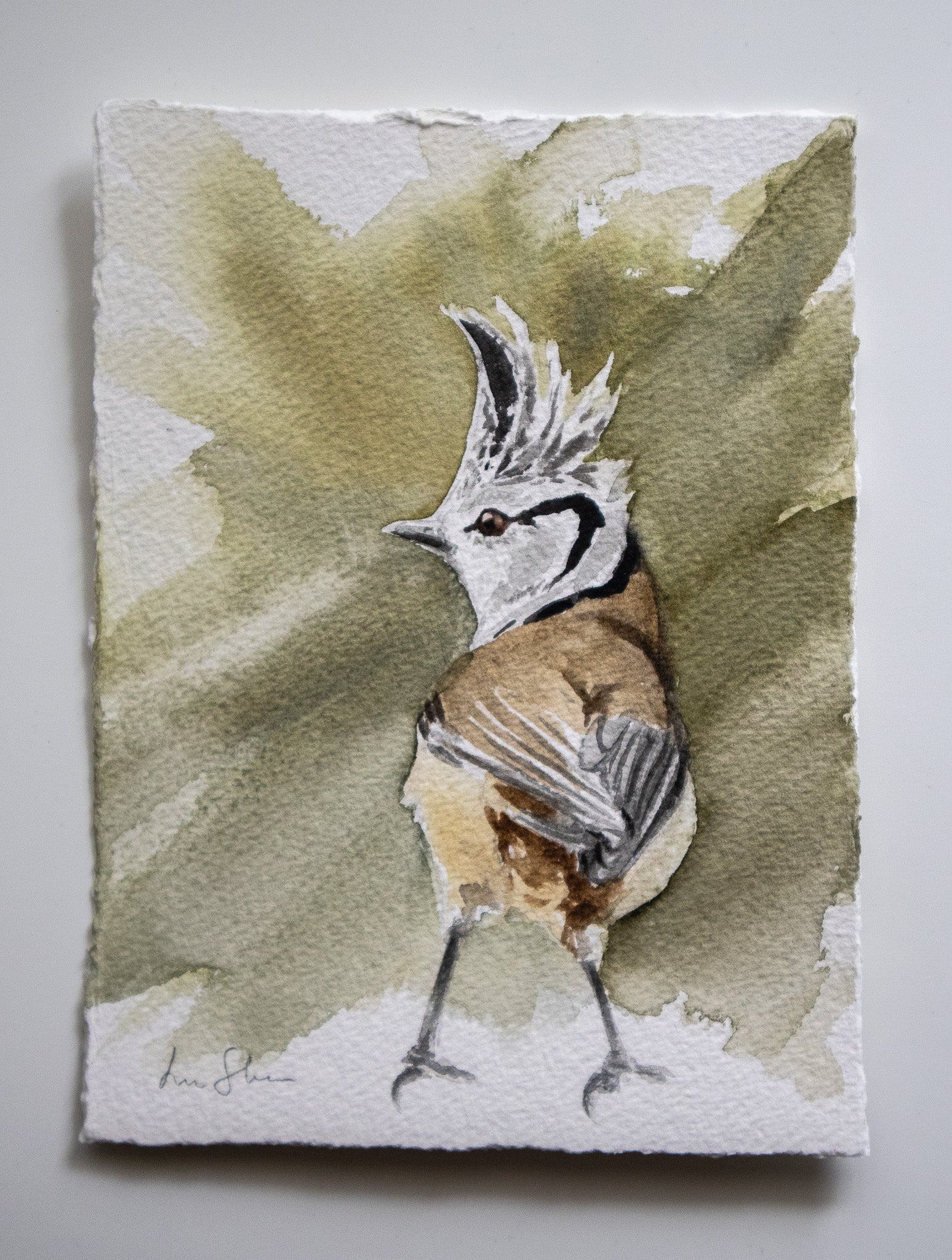 En tofsmes, målad på tjockt, lyxigt Arches bommullspapper. Målningen mäter 14 x 19 cm och har vackert rivna kanter.