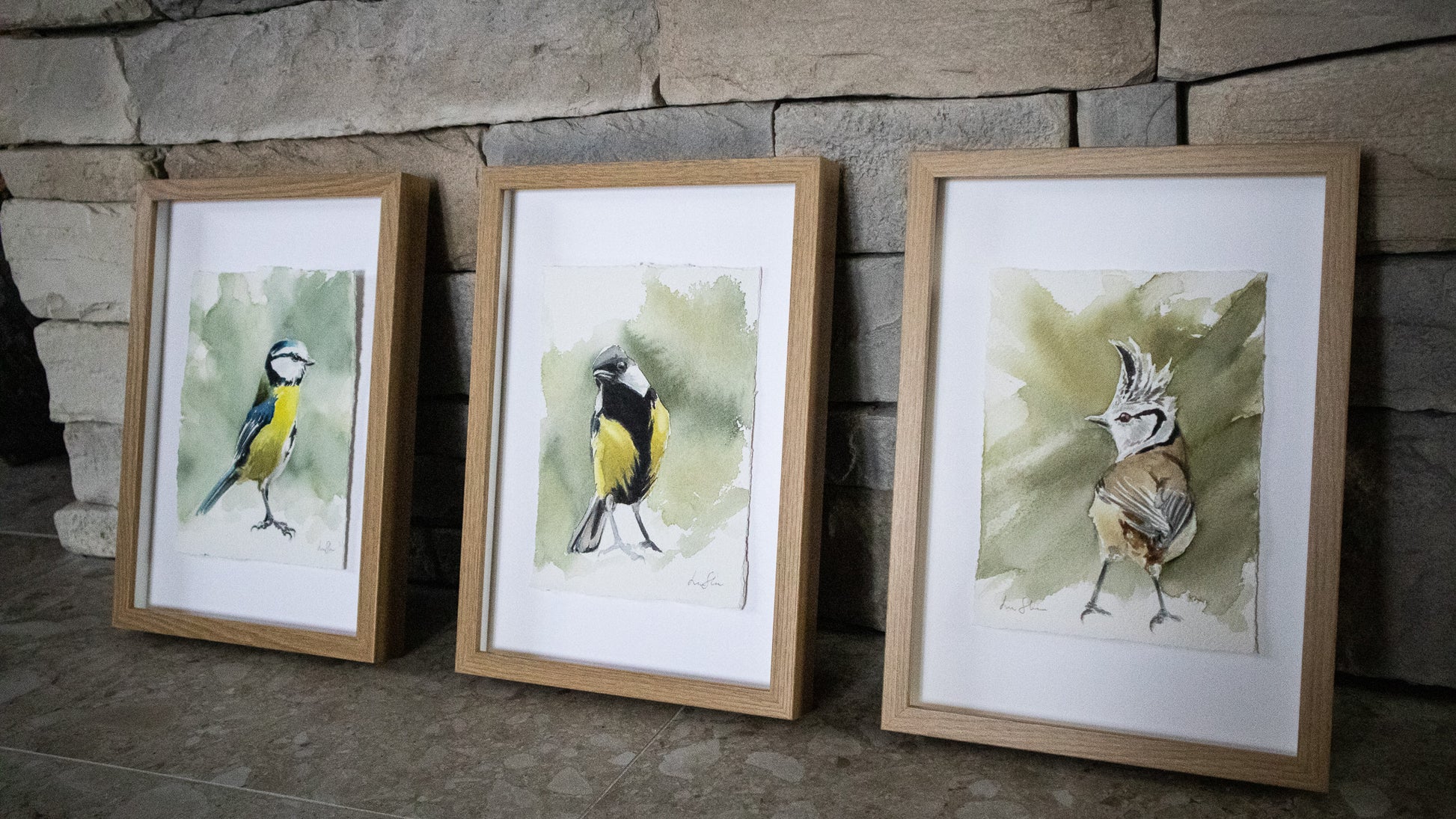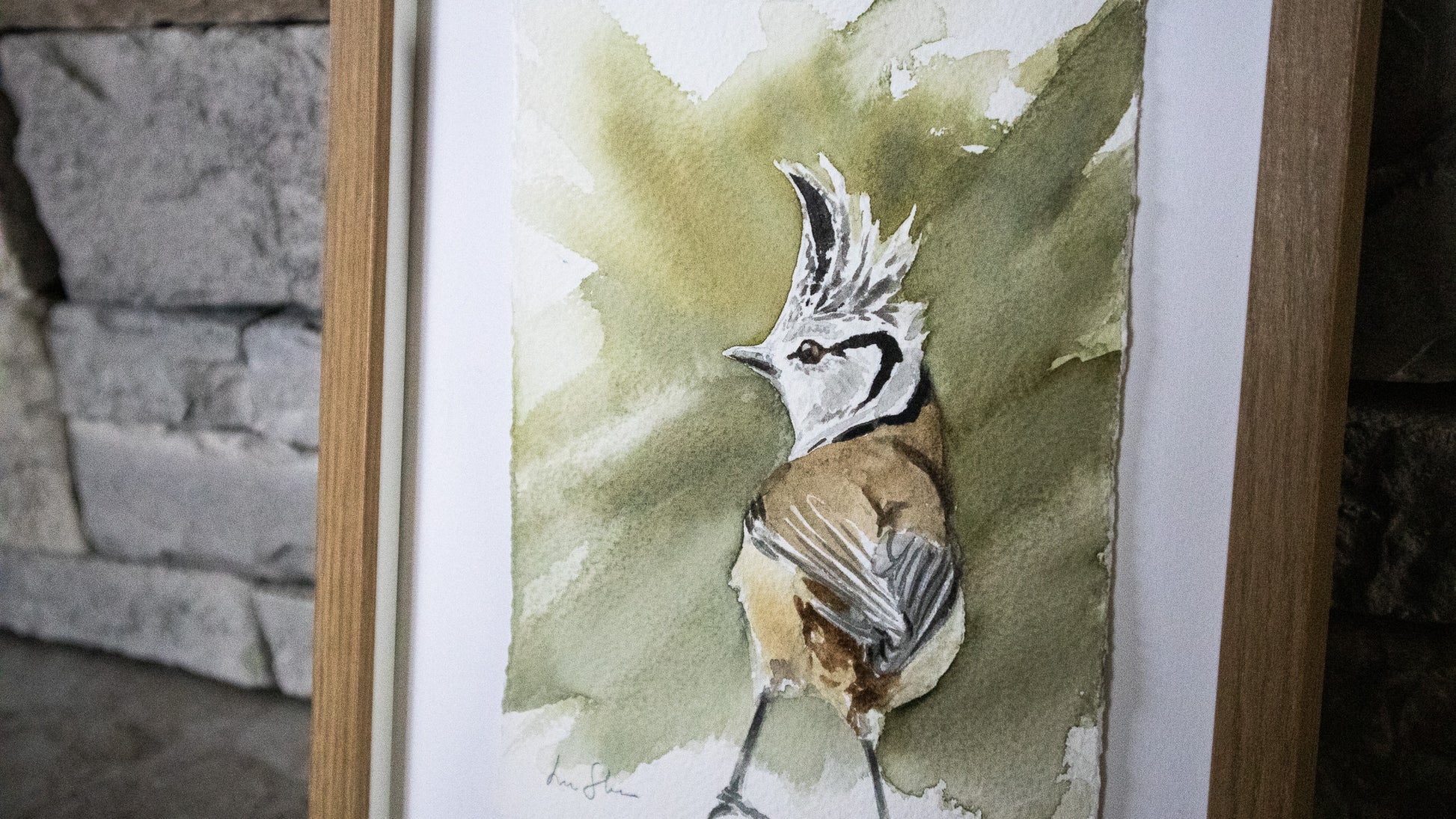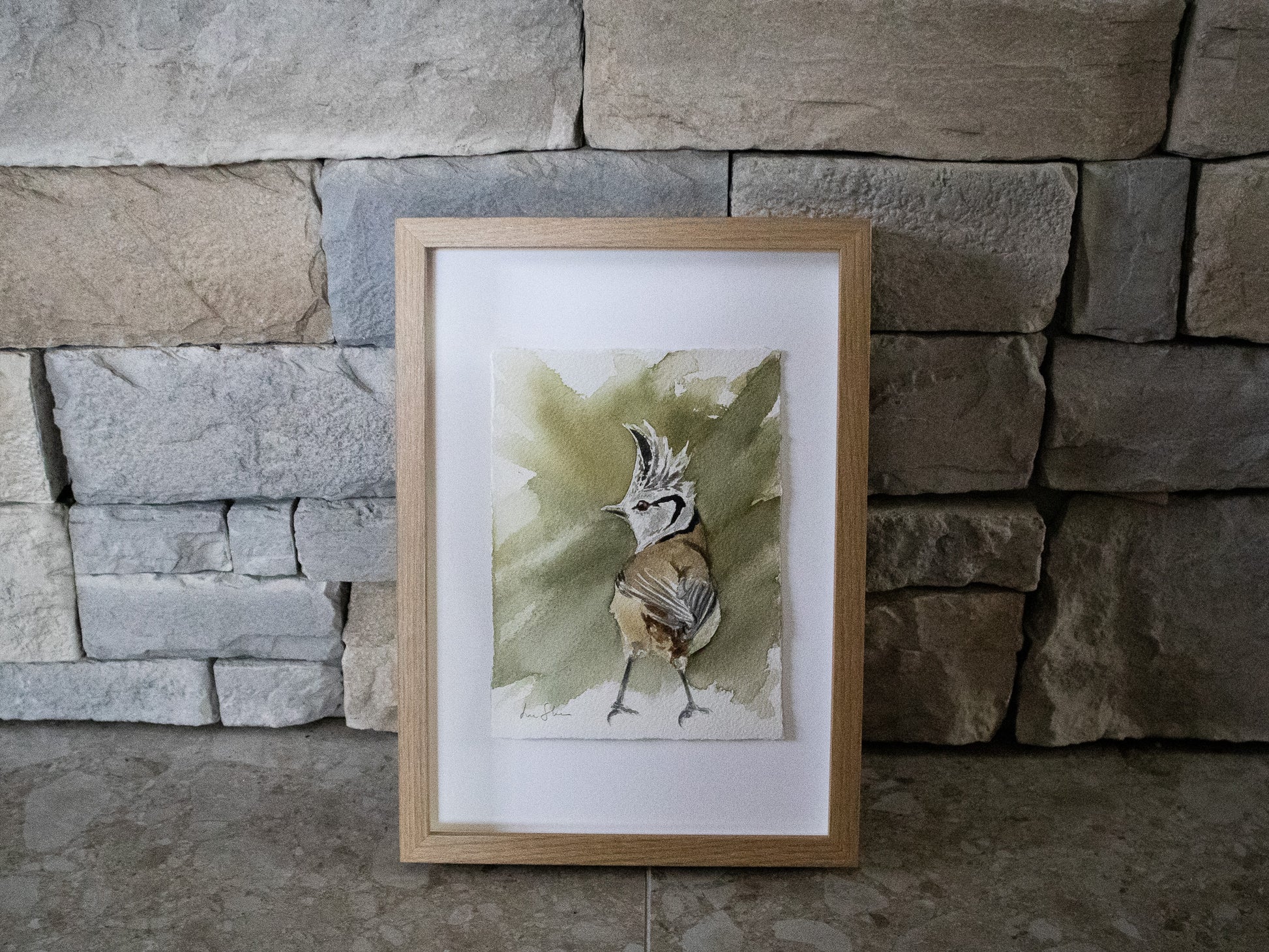 En tofsmes, målad på tjockt, lyxigt Arches bommullspapper. Målningen mäter 14 x 19 cm och har vackert rivna kanter.