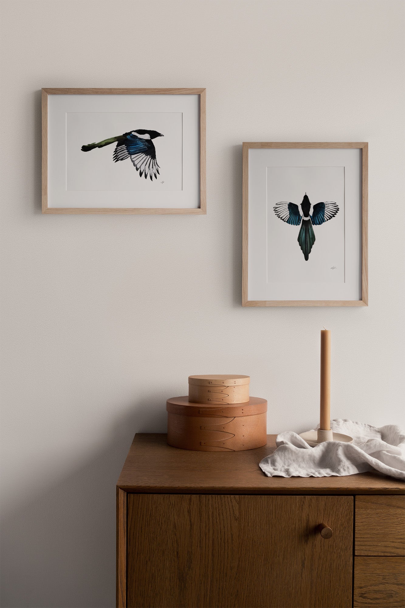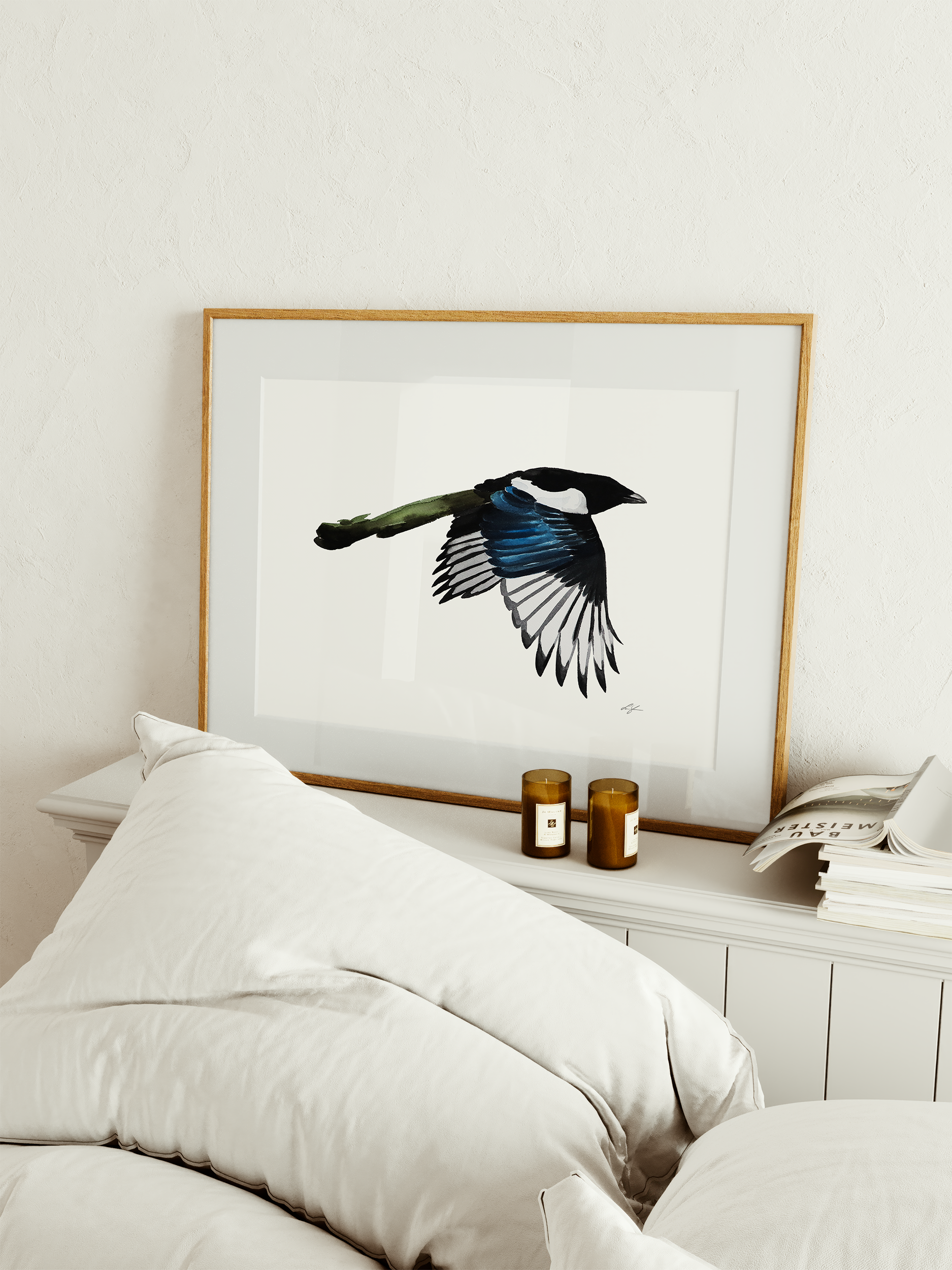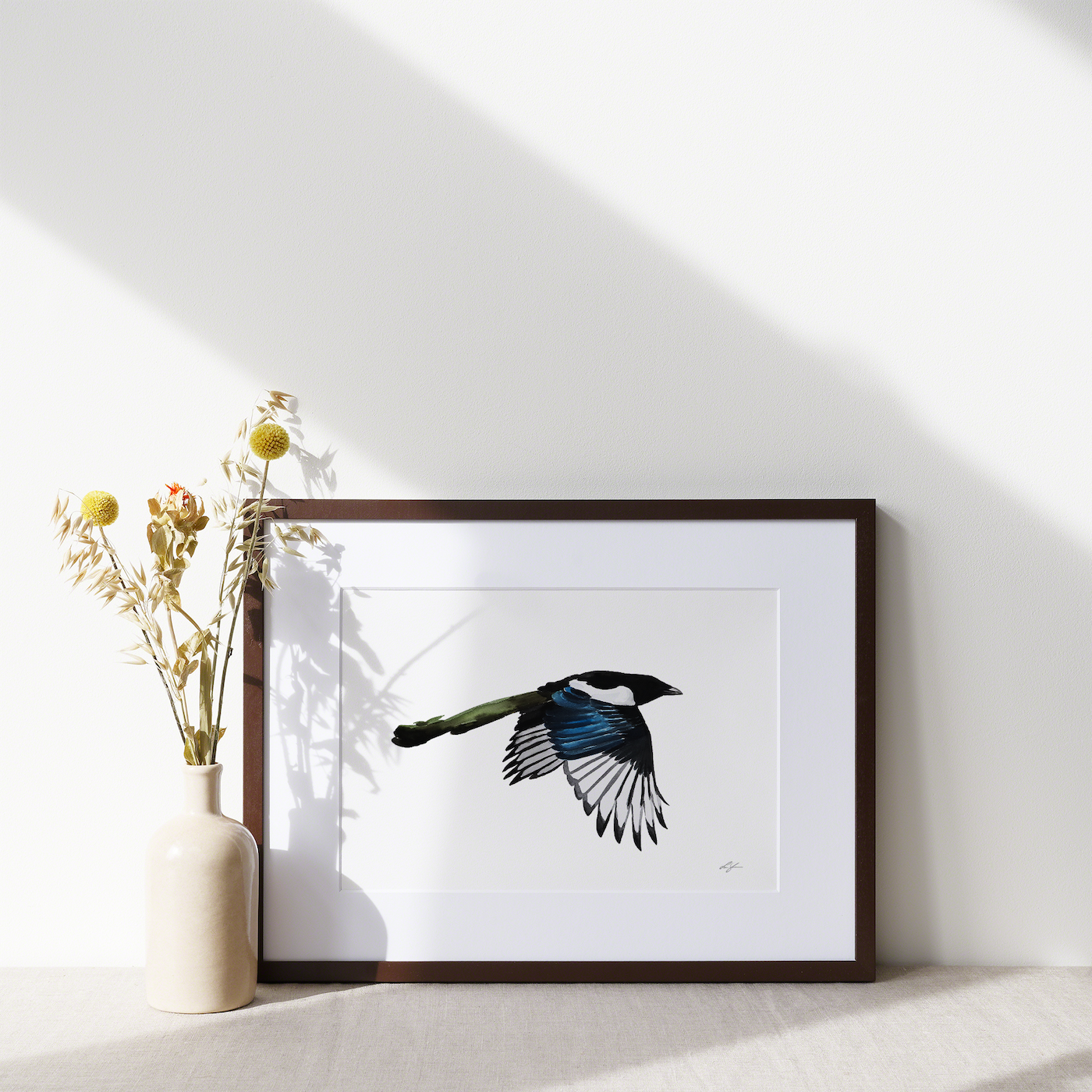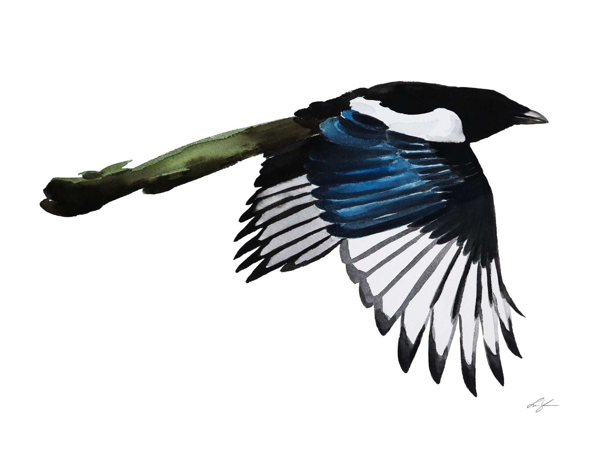 Konsttryck av min akvarellmålning "Skata 1", från kollektionen Vingslag från 2022.