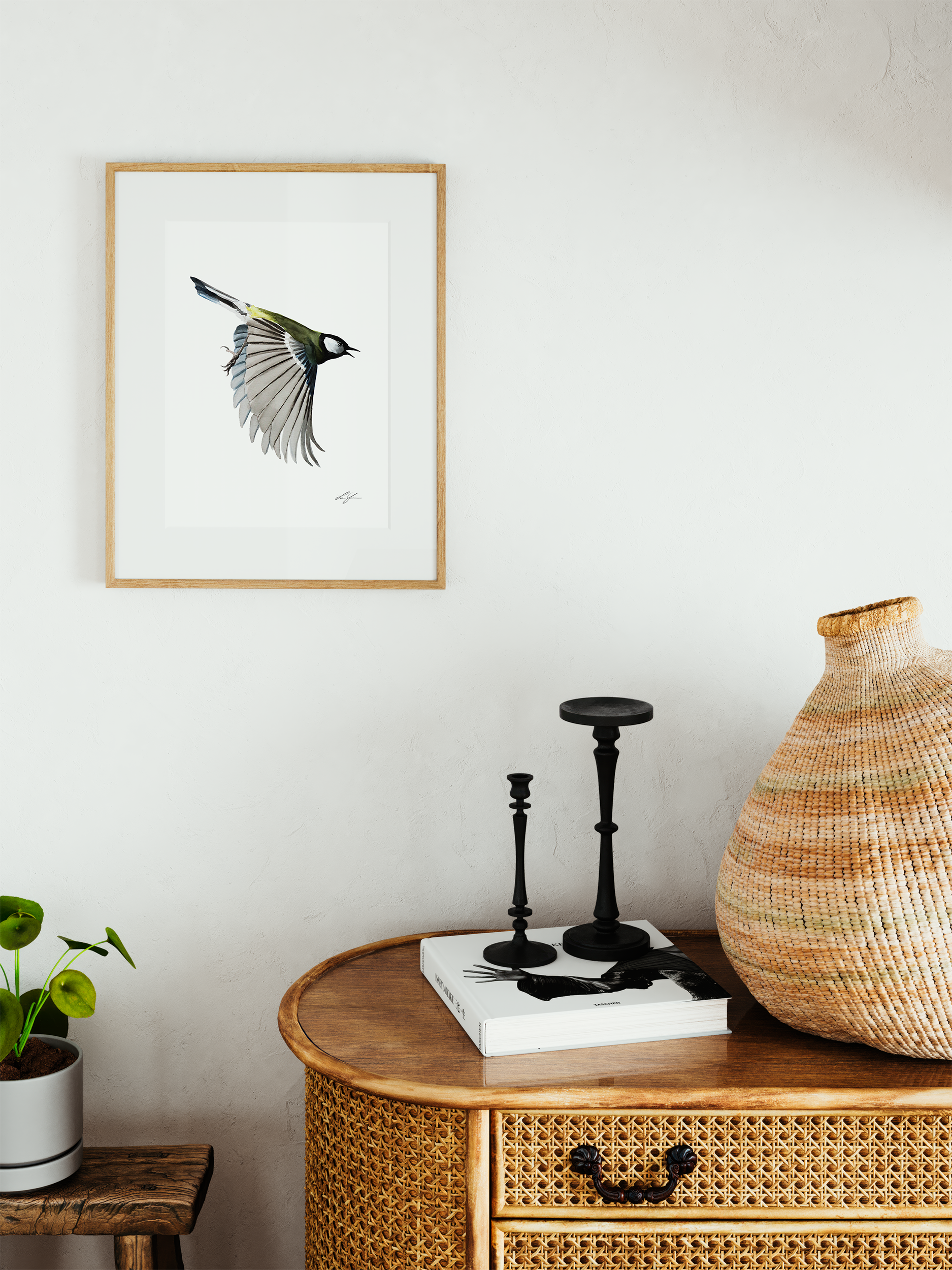 Konsttryck av min akvarellmålning "Talgoxe 2", från kollektionen Vingslag från 2022.