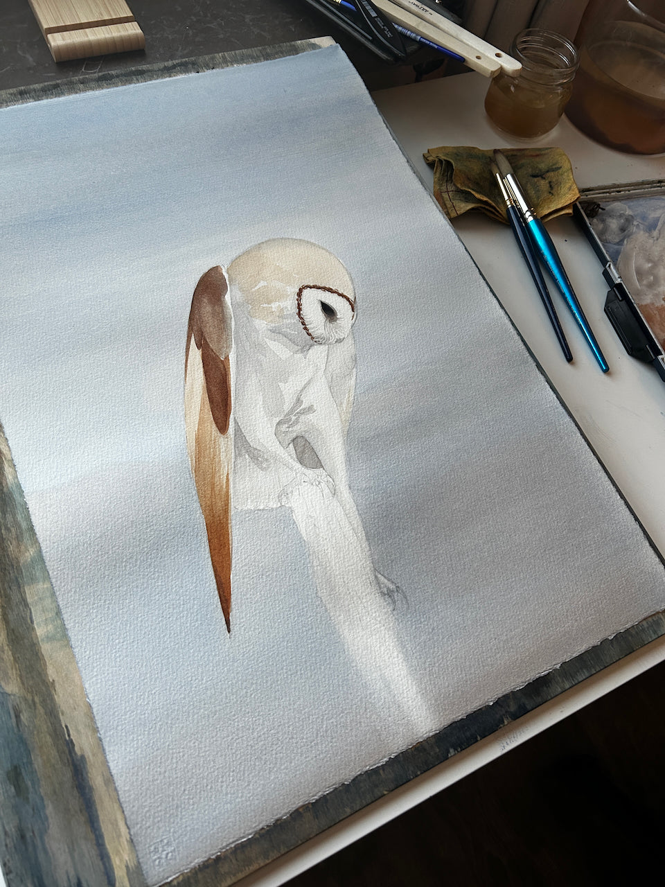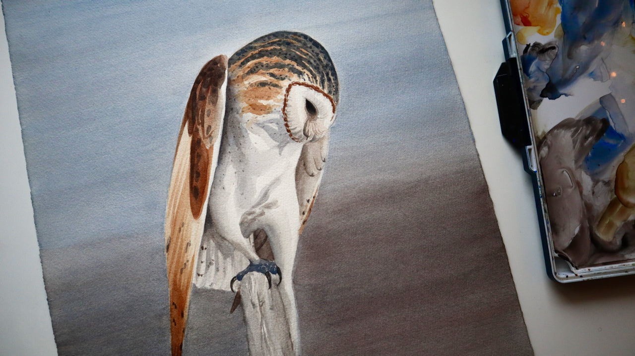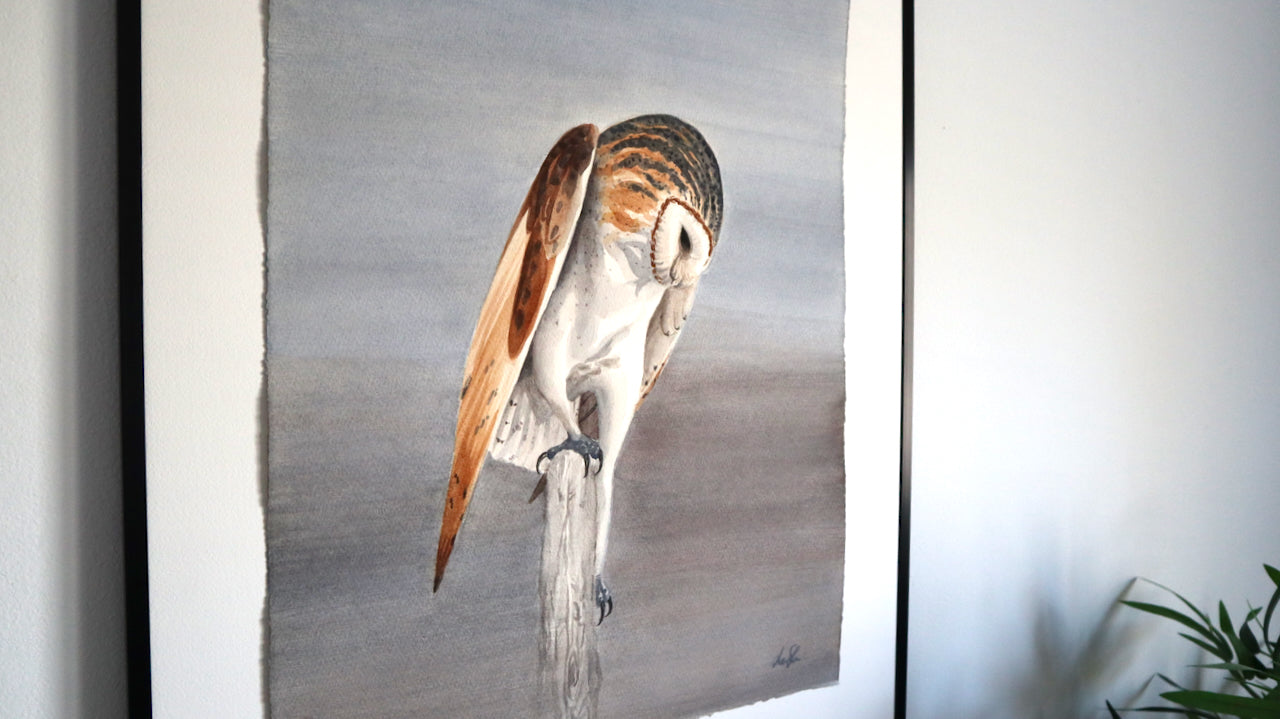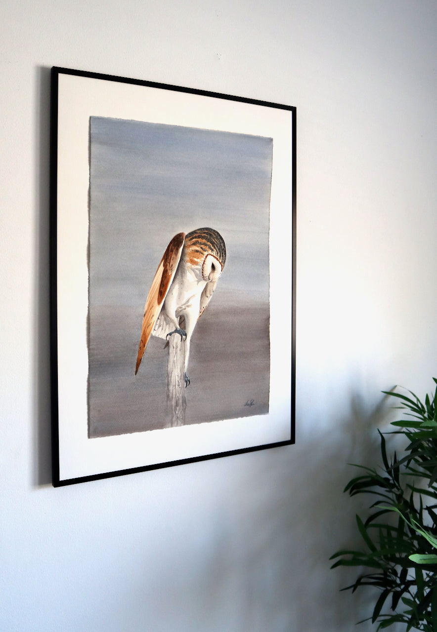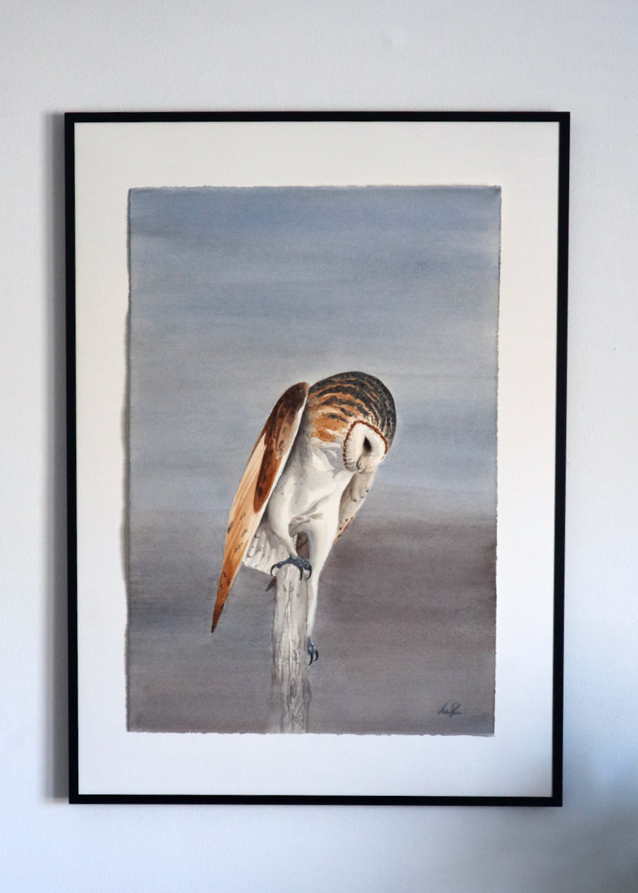En hemlighetsfull tornuggla, målad på lyxigt Arches 300g bommullspapper. Målningen mäter 38 x 57cm och har vackert rivna kanter.